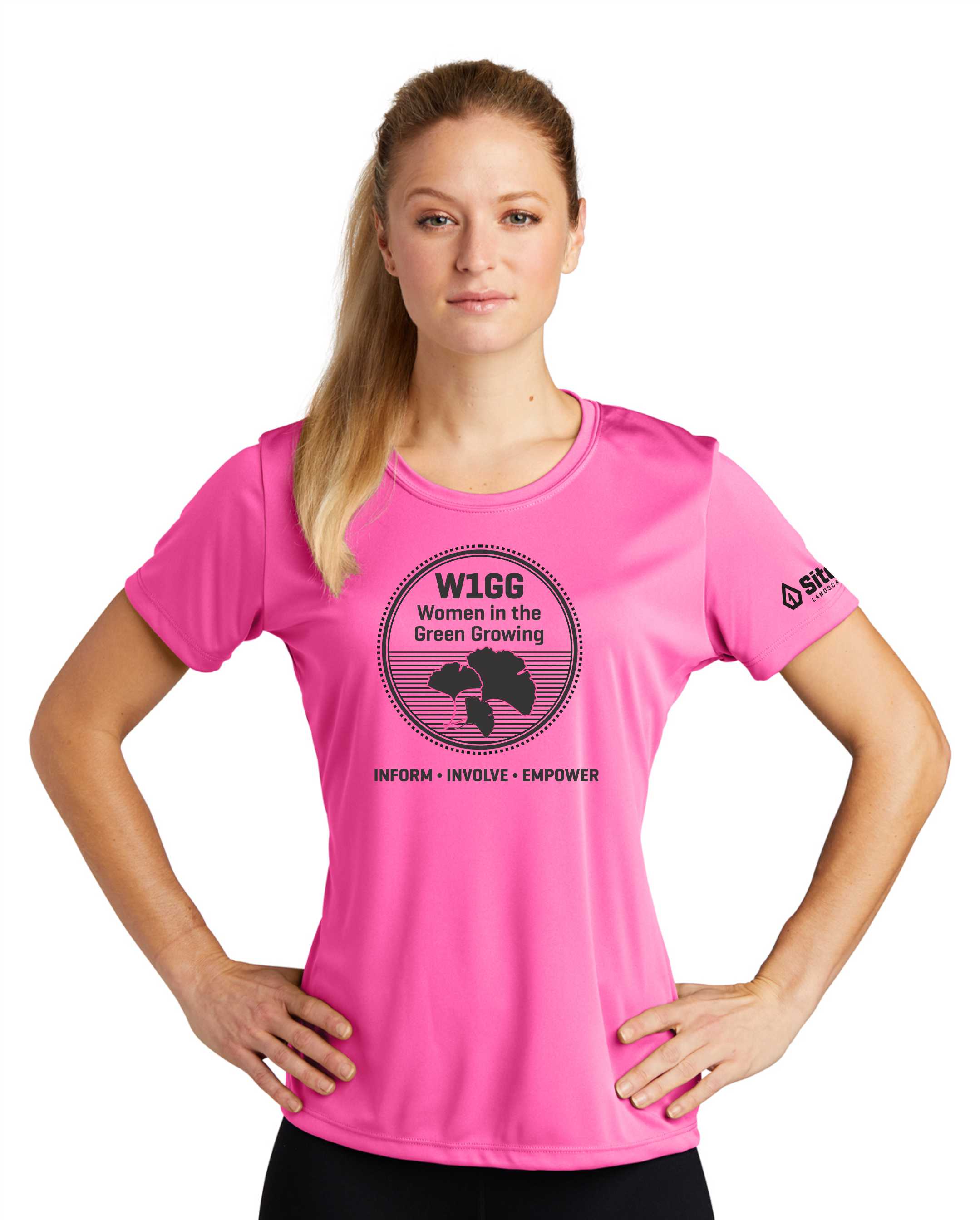 W1GG Ladies Pink Shirt. Inform. Involve. Empower